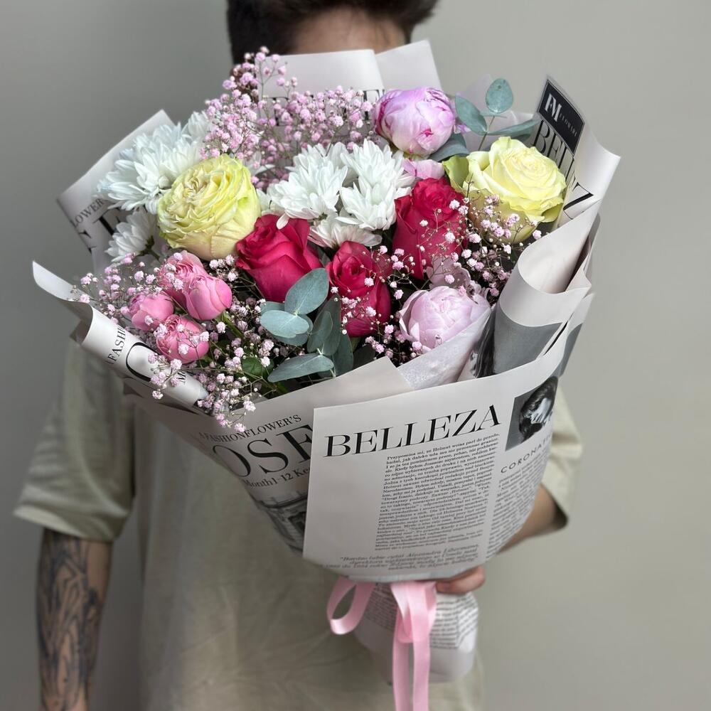 Альстромерии, Кустовые розы, Лизиантусы, Пионовидные розы, Розы, Ромашки