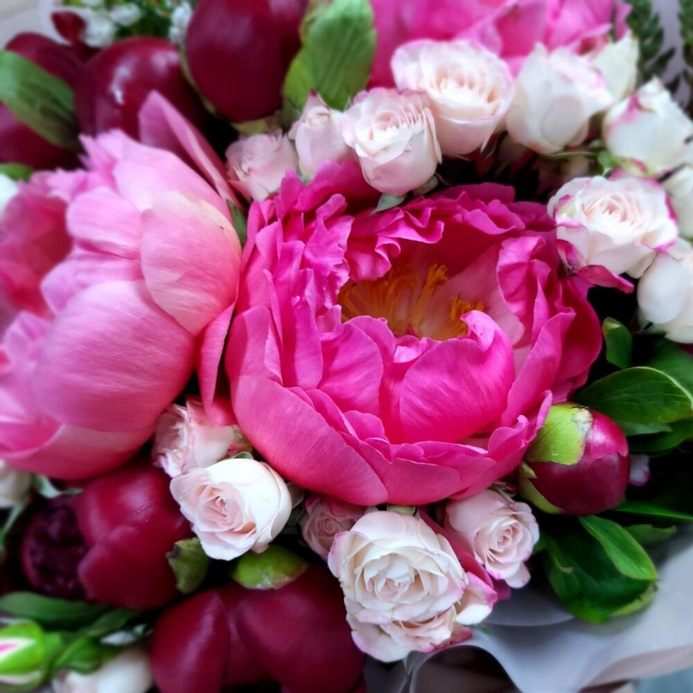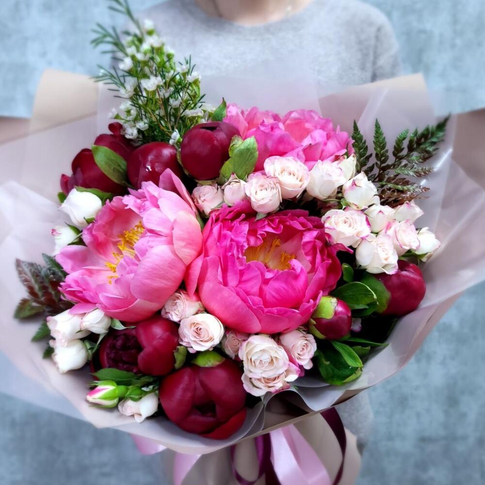 Ваксфлауэр – 1 шт.Папоротник – 2 шт.Пион – 10 шт.Роза кустовая – 7 шт.Упаковка дизайнерская – 1 шт.