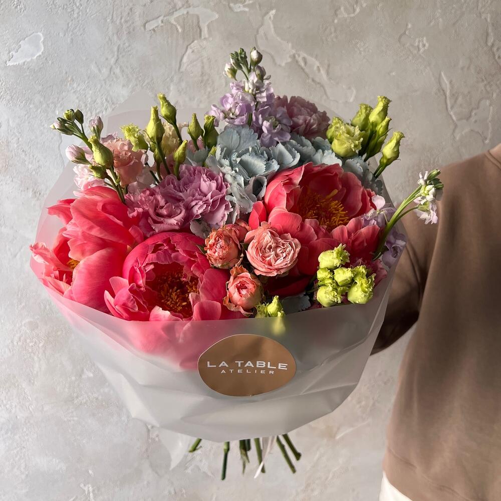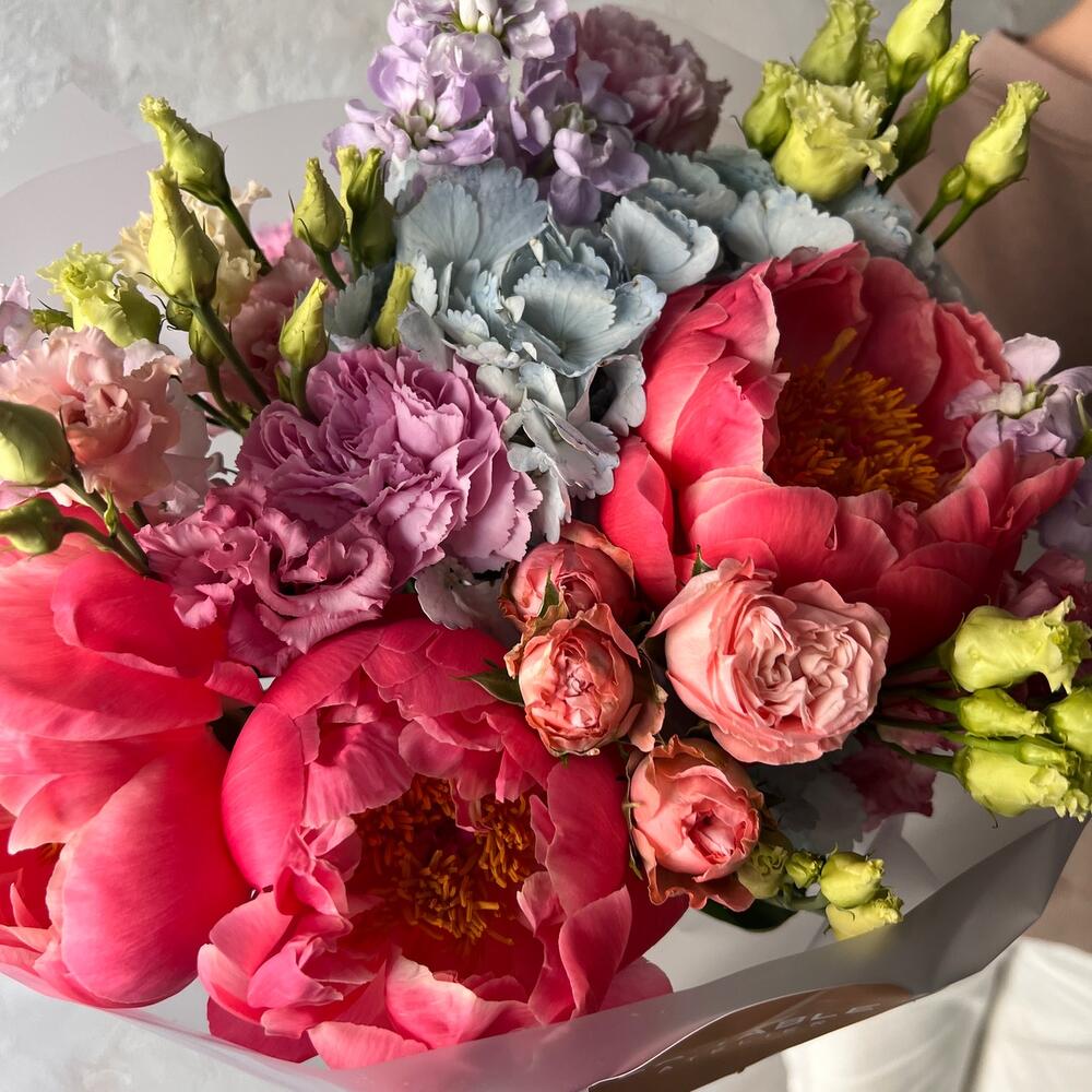 Пион – 3 шт.Гортензия – 1 шт.Маттиола – 3 шт.Роза кустовая – 1 шт.Лизиантус – 3 шт.Гвоздика – 3 шт.Упаковка дизайнерская – 1 шт.