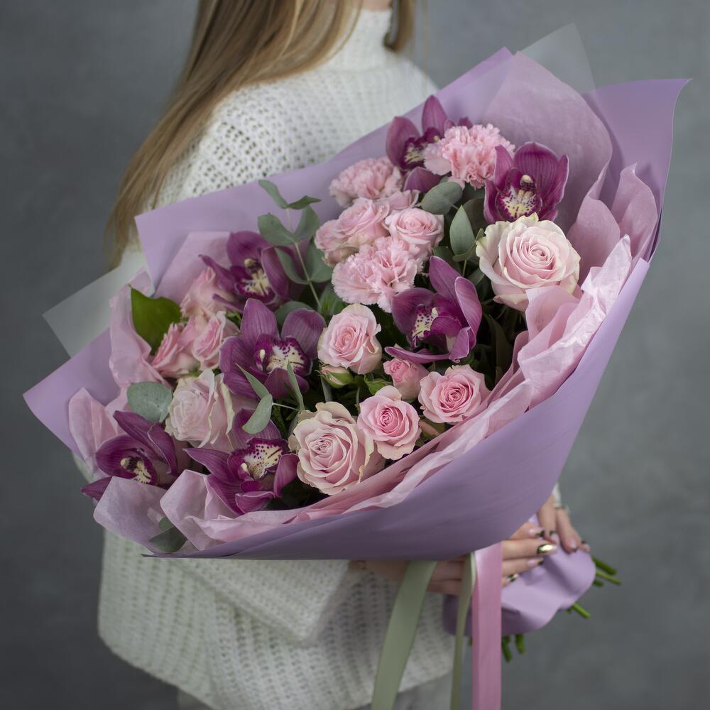 орхидея – 7 шт.Роза кустовая – 3 шт.Роза – 3 шт.Диантус – 3 шт.Эвкалипт – 3 шт.Фисташка – 3 шт.