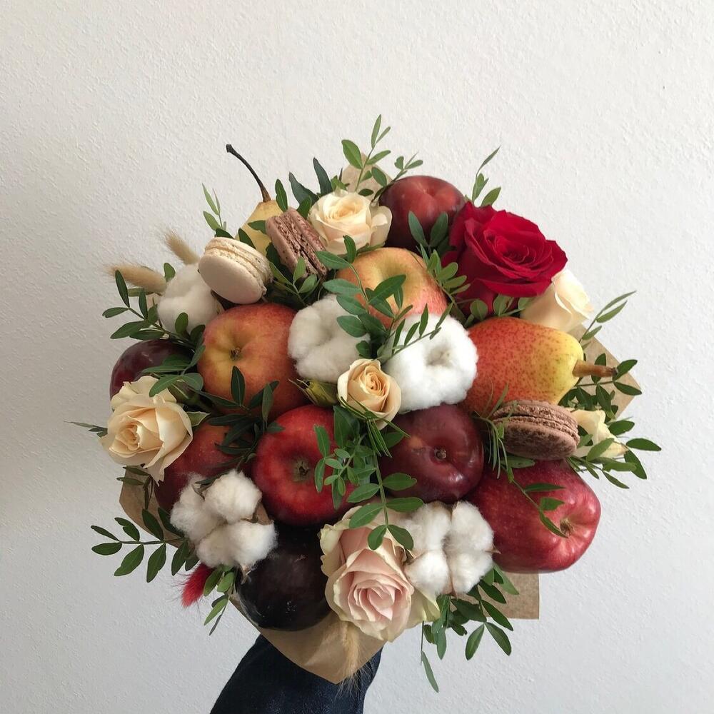 груши – 3 шт.яблоки – 5 шт.Сливы – 3 шт.Нектарины – 3 шт.Макарон – 3 шт.Хлопок – 5 шт.розы – 5 шт.зелень фисташки – 3 шт.Лагурус – 2 шт.