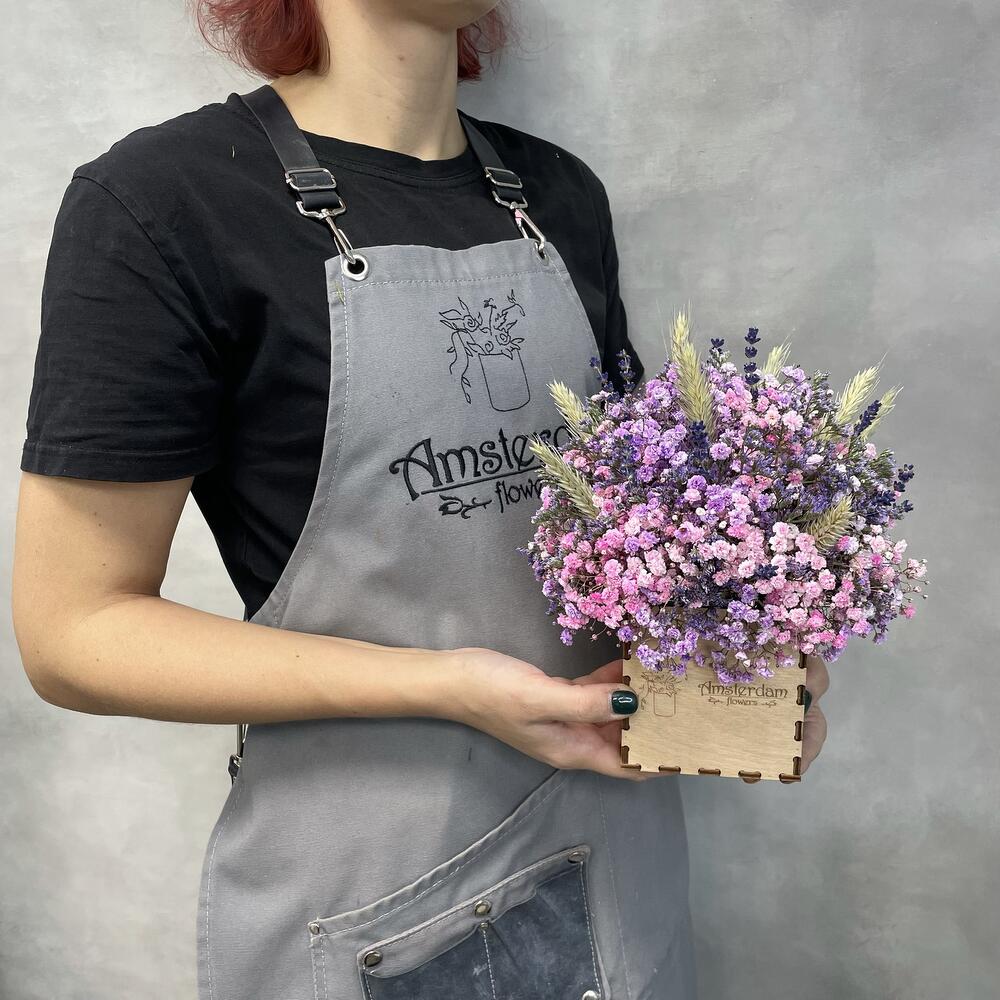 гипсофила микс – 5 шт.Лимониум МИКС – 4 шт.Лаванда (сухоцвет) – 15 шт.Пшеница (сухоцвет) – 9 шт.Ящик деревянный 10*10 – 1 шт.