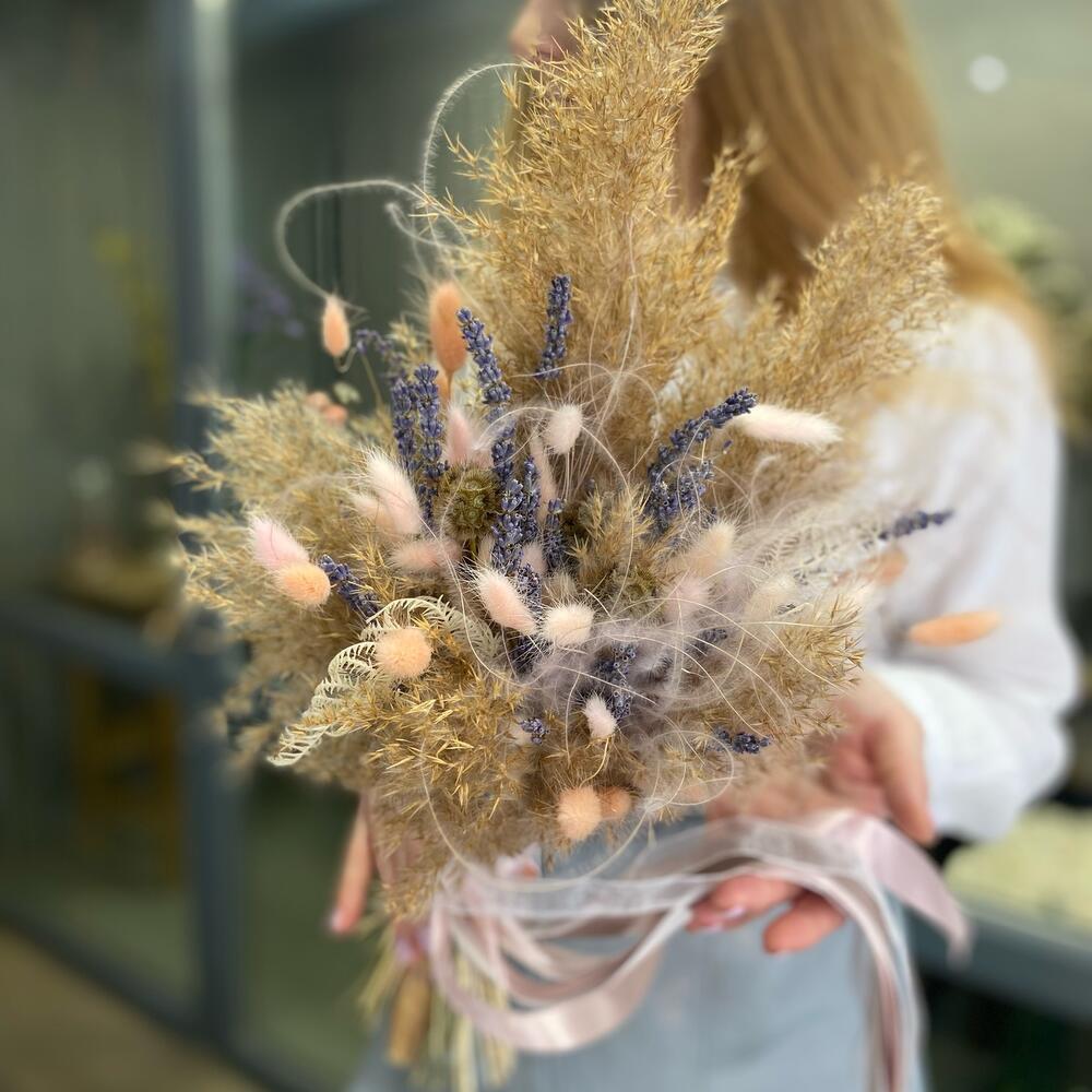 кортадерия – 5 шт.Лаванда – 11 шт.Ковыль – 2 шт.Лагурус (сухоцвет) – 11 шт.
